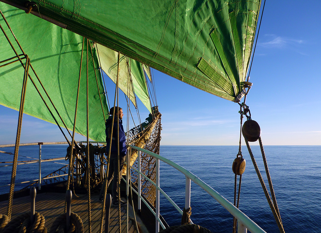 Da die nördlichen Winde zunächst das Segeln unmöglich machten, wurde der Unterwasserbesan gesetzt, und so kam bald an Steuerbord die Insel Helgoland in Sicht. Die Wachen nutzen die "Wissenden", um uns "Unwissenden" in maximale Verwirrung zu treiben: Wir sollten die Namen der Segel und deren Bedienung lernen, und vor allem möglichst die Position der Tampen verinnerlichen. Doch die "Tampenjagt" zeigte schnell: hier wird noch die ein oder andere Wiederholung nötig sein. Die Alex stampfte unterdessen tapfer gegen See und Wind nach Nordwest, um möglichst Raum für Segelstrecken zu gewinnen. Und genau dieses Stampfen forderte nun die ersten Opfer: nach weichen Knien gabe es das bekannte Magengefühl, und so Mancher suchte verzweifelt die Lee-Reling, was nicht so leicht fällt, wenn man recht genau in Windrichtung fährt. Immerhin, nun wurde auch gesegelt, und für die Wachen begann ein recht stetiges Manöver: Mithilfe des Messingbesan nach Nordwest, dann Segel setzen und nach Nordost segeln, bis die nahe Küste wieder das Streichen der Segel und das Setzen des Unterwasserbesan forderte.